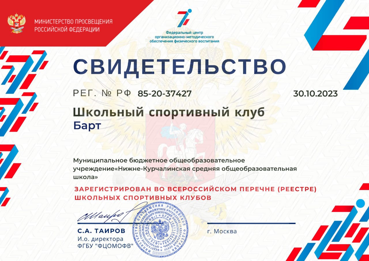 СВИДЕТЕЛЬСТВО ШКОЛЬНОГО СПОРТИВНОГО КЛУБА БАРТ