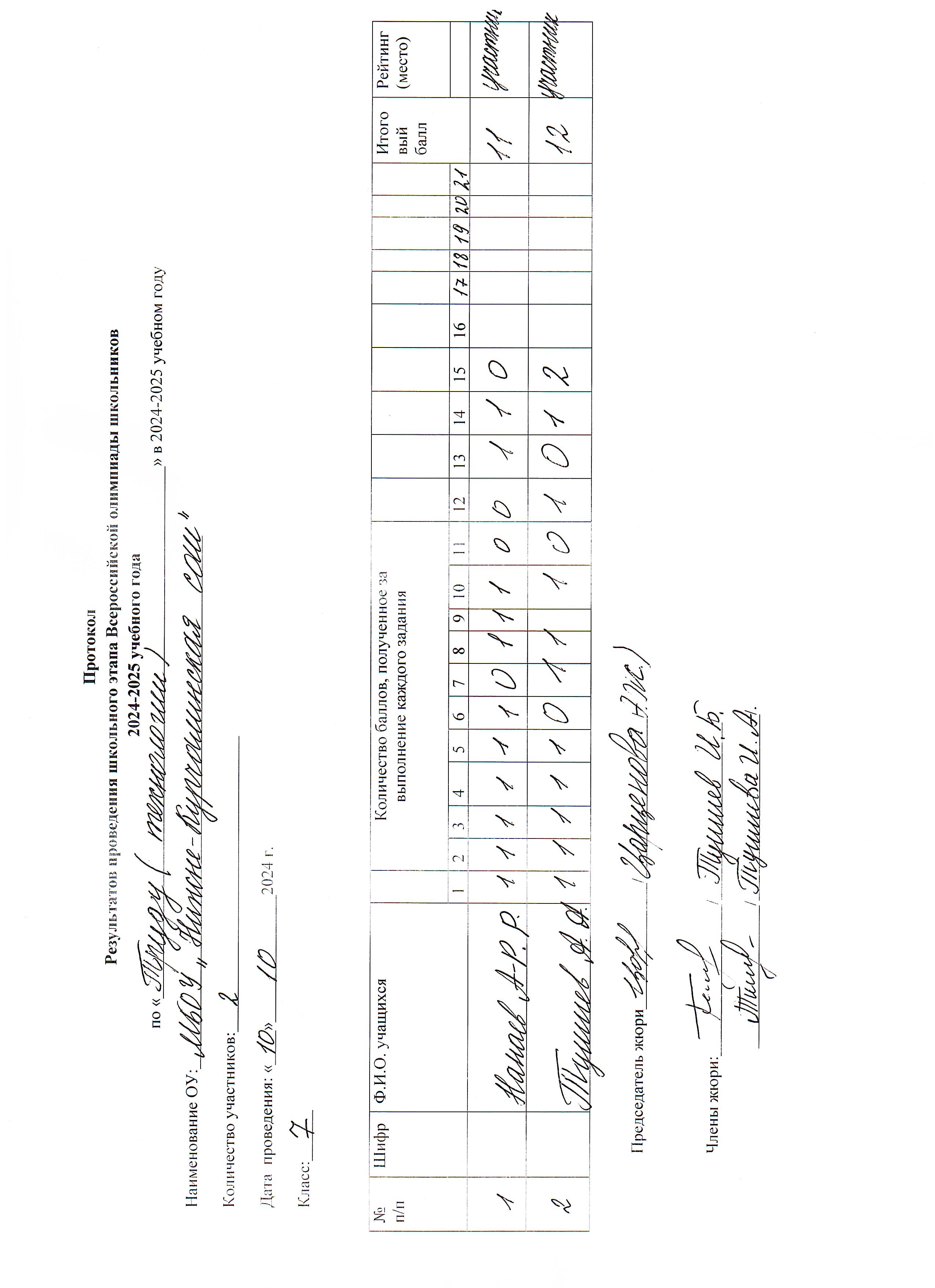 Протокол по ВСОШ по предмету труд 7 класс 2024 год